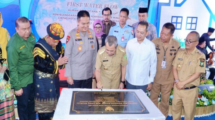 Kualu, Tambang, MataAura.com – Dengan diresmikannya Instalasi Pengolahan Air (IPA) Sistem Penyediaan Air Minum (SPAM) Pekanbaru – Kampar yang ditandai dengan Pembukaan Kran dan dilanjutkan dengan penandatanganan Prasasti. Peresmian First Water Flow (Aliran Air Pertama) Penyelenggaraan Sistem Penyediaan Air Minum (SPAM) Lintas Kota Pekanbaru dan Kabupaten Kampar kapasitas 1000 liter Perdetik di Desa Kualu, Kecamatan Tambang, Selasa, 27/06. Pemutaran Kran ini menandai SPAM ini telah dioperasionalkan, dan siap menyalurkan ke rumah – rumah masyarakat di lima kecamatan, diantaranya dua kecamatan di Kabupaten Kampar dan tiga kecamatan di Kota Pekanbaru yang akan melayani sebanyak 624.000 Jiwa atau 102.000 Rumah tangga.