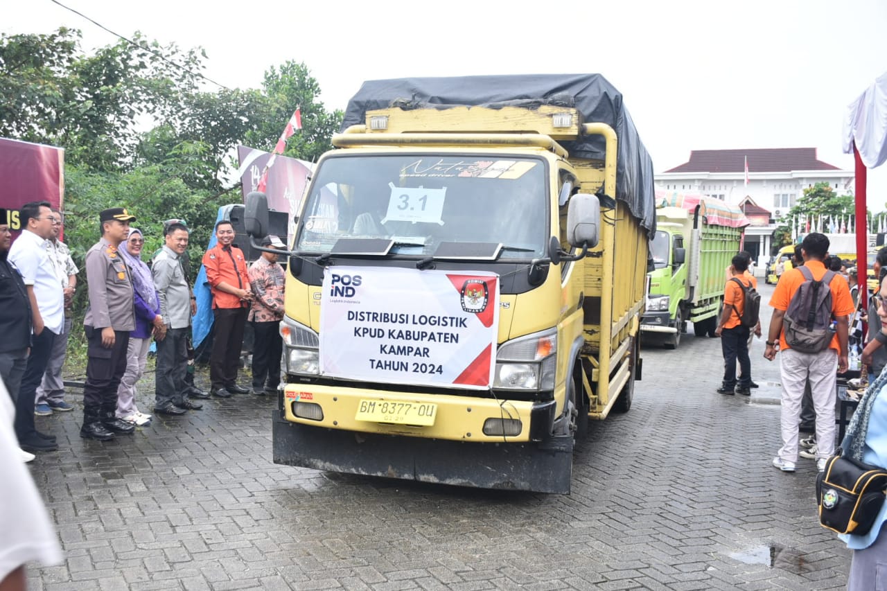 BANGKINANG KOTA, MataAura.com – Penjabat Bupati Kampar H Hambali melepas secara langsung pendistribusian logistik Pemilu tahun 2024, di Halaman Kantor Komisi Pemilihan Umum (KPU) Kabupaten Kampar, Jalan Tuanku Tambusai, Kelurahan Langgini, Kecamatan Bangkinang Kota, Kabupaten Kampar, Jum’at (09/02/2024) pagi.