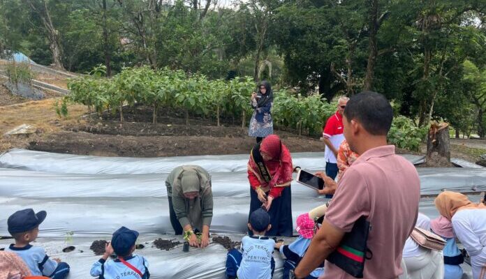 Mataaura.com-BANGKINANG KOTA – Kepala Dinas Pertanian Tanaman Pangan dan Hortikultura Kabupaten Kampar Nurilahi Ali mendampingi Bunda Paud Kampar Ricana Djayanti Hambali bersama murid TK Pertiwi melakukan panen cabai di kebun cabai Taman Agrowisata Stanum Bangkinang, Sabtu (28/9/2024).