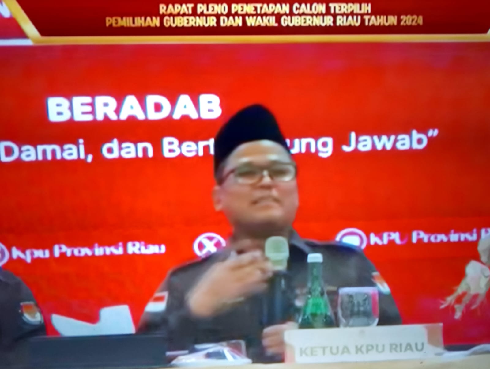 Mataaura.com-PEKANBARU – Komisi Pemilihan Umum (KPU) Provinsi Riau menggelar rapat pleno calon terpilih pada pemilihan Gubernur dan Wakil Gubenur Riau tahun 2024, Kamis (09/01/2025) siang, bertempat di Ballroom, Hotel Grand Zuri Pekanbaru, Kota Pekanbaru.