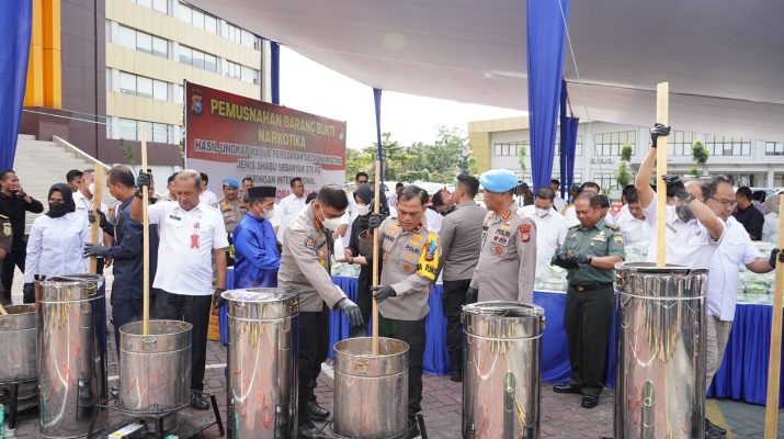 MataAura.com-PEKANBARU – Wakil Kepala Kepolisian Daerah (Kapolda) Riau, Brigjen Pol Kasihan Rahmadi melakukan pemusnahan Barang Bukti (BB) Narkoba jenis sabu sebanyak 276 kilogram di