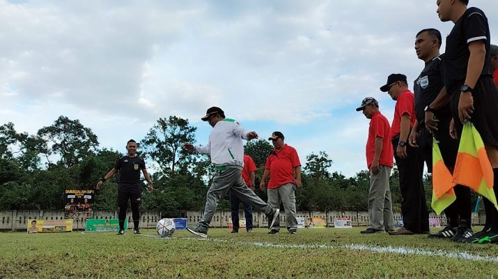 MataAura.com-KAMPAR KIRI – Ketua Komisi II lakukan tendangan pertama pertanda dibukanya Turnamen Sepak Bola Darussalam Cup l. Turnamen yang diikuti oleh 32 klub se-Rantau